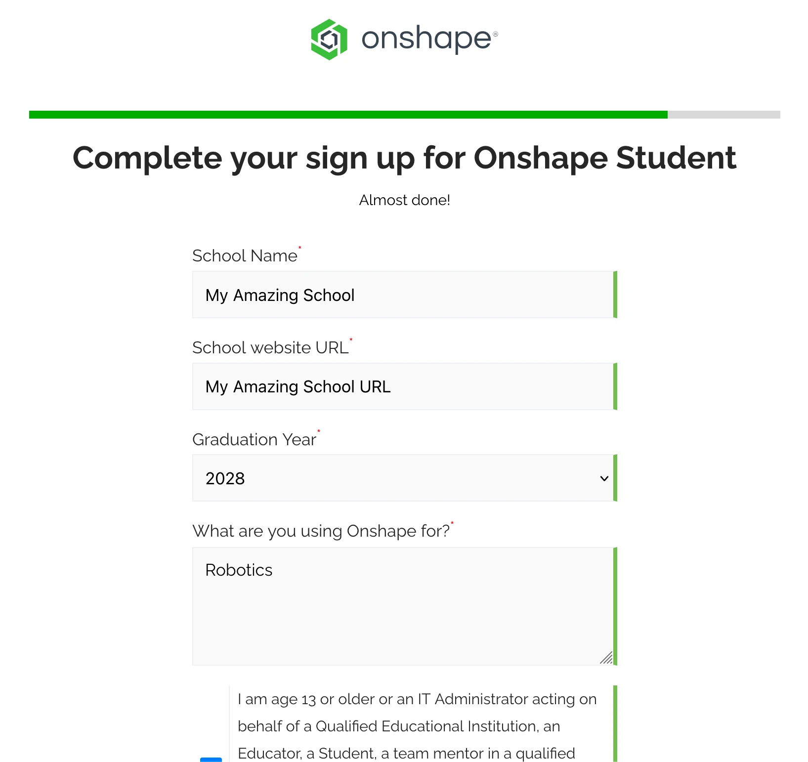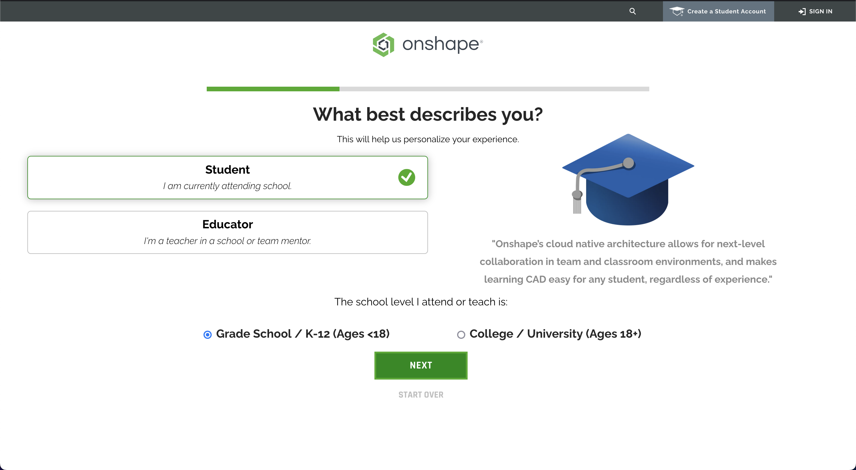 Onshape offers a free education license for students to use their software. It is highly recommended to use the education plan, as it allows for the creation of private documents, as well as other useful features.