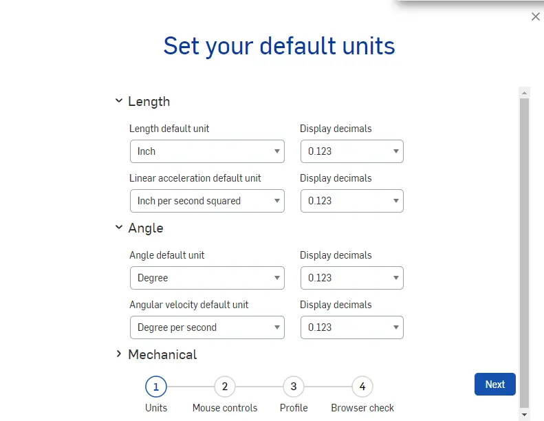 The first time you enter Onshape, it will prompt you to set up your account, including the default units and mouse controls used when doing CAD. You can also set a profile picture and a nickname (we recommend keeping this as your real name).